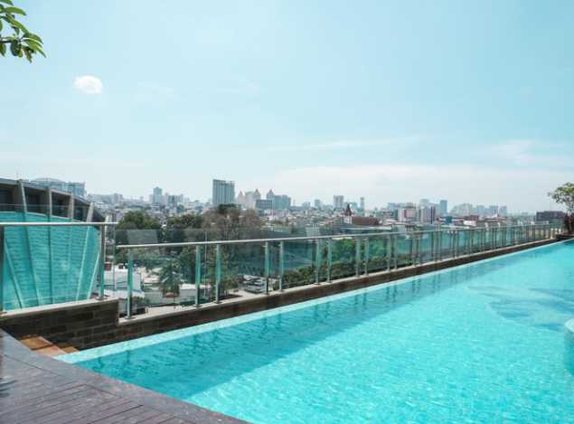 •使用できる設備は多くないが、ジムは充実していて、セミアウトドアの大きなプールがある。